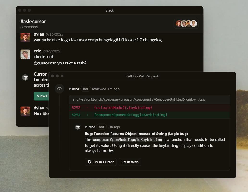 Cursor is in GitHub reviewing your PRs, a teammate in Slack, and anywhere else you work